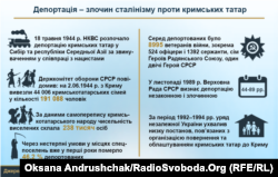 У неділю, 18 травня, виповнюється 70 років з дня депортації сталінським режимом кримськотатарського народу. Причиною висилки цілого народу були названі факти нібито масового колабораціонізму та співпраці великої частини кримських татар із німецькими та румунськими окупантами під час Другої світової війни. За оцінками істориків, на засланні від нестерпних умов, голоду, хвороб загинули більше ніж 40 відсотків переселених. На відміну від інших депортованих народів, які повернулися на батьківщину наприкінці 1950-х років, кримські татари були позбавлені цього права формально до 1974 року, фактично ж – до 1989-го.