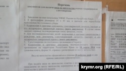 Усередині приміщення вивішений перелік документів, необхідних для отримання посвідки на проживання. Він стосується тих, хто до 18 квітня 2014 року, маючи кримську прописку, виявив бажання зберегти громадянство України. Для цього необхідно написати заяву на ім'я начальника УФМС Росії в Криму, надати дві особисті фотографії, документ, що засвідчує особу та його копію (у разі надання українського закордонного паспорта – нотаріально засвідчений його переклад російською мовою), свідоцтво про народження та його копію, а також підтвердження постійного проживання на території Криму на 18 березня 2014 року (штамп у паспорті громадянина України).