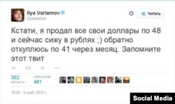 9 листопада знаний в Україні та Росії блогер і журналіст Ілля Варламов написав у своєму твітері, що продав долари по 48 рублів і сподівається за місяць відкупити їх назад по 41 рублю за долар. «Запам’ятайте цей твіт», – додав він. І медіа-спільнота запам’ятала, а за місяць нагадала Варламову про його помилку.
