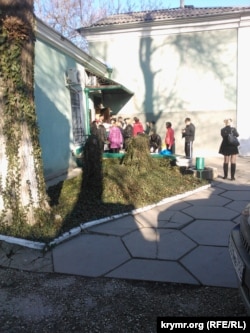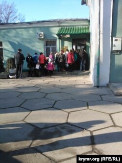 В очікуванні своєї черги люди товпляться біля дверей. На вході чергують два бійці кримської «самооборони». Вони запускають в приміщення по кілька людей. Хтось із черговиків бере на себе роль контролера – стежить за списком, викрикує номери і прізвища тих, чия черга підійшла. Переваг немає ні у вагітних, ні у жінок з немовлятами. Вони чекають разом з усіма. Однак «паперова» черга часто дає збої.
