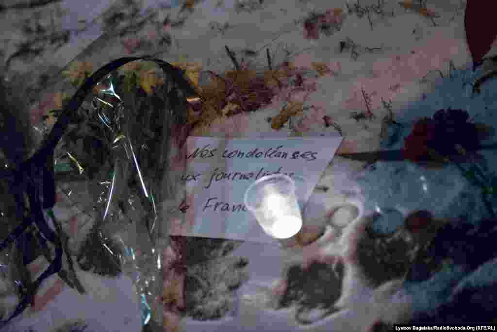 Кілька десятків людей прийшли до Посольства Франції в Україні, аби покласти квіти та запалити свічки. Кияни принесли під будівлю посольства кілька плакатів на підтримку свободи слова та на знак співчуття родинам і колегам загиблих, а також кілька карикатур, що раніше пулікувалися у тижневику Charlie Hebdo. У середу, 7 січня, у результаті нападу на редакцію було вбито 12 людей, ще 11 були поранені.