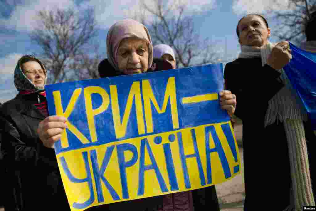 Жінки кримськотатарської громади вигукують гасла під час проукраїнської демонстрації біля села Іллінка 14 березня 2014 року.