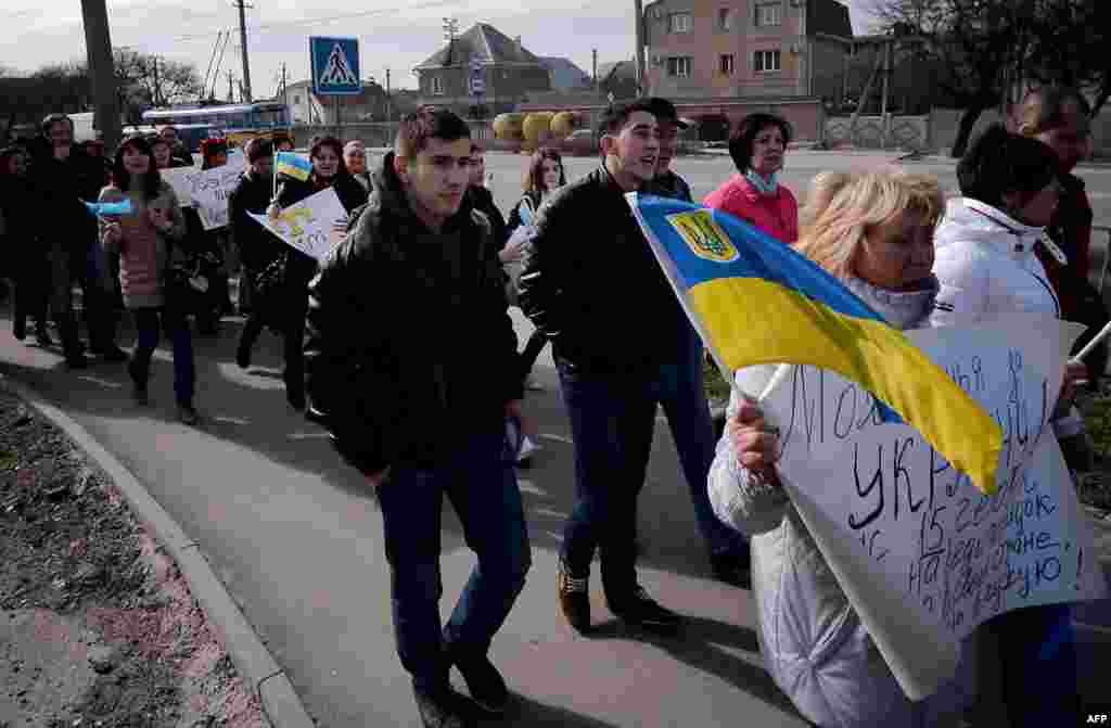 Проукраїнські демонстранти під час антивоєнної демонстрації біля пам'ятника Тарасу Шевченку в Сімферополі, 7 березня 2014 року.