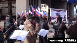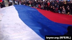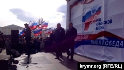 Сімферополь – У Криму з помпезністю почали відзначати річницю від дня «приєднання» півострова до Росії. У містах і районах проходять святкові концерти та збори, у школах – уроки, присвячені подіям «Кримської весни». За тим, як пройшов перший день свята в кримській столиці, спостерігав кореспондент Крим.Реалії.