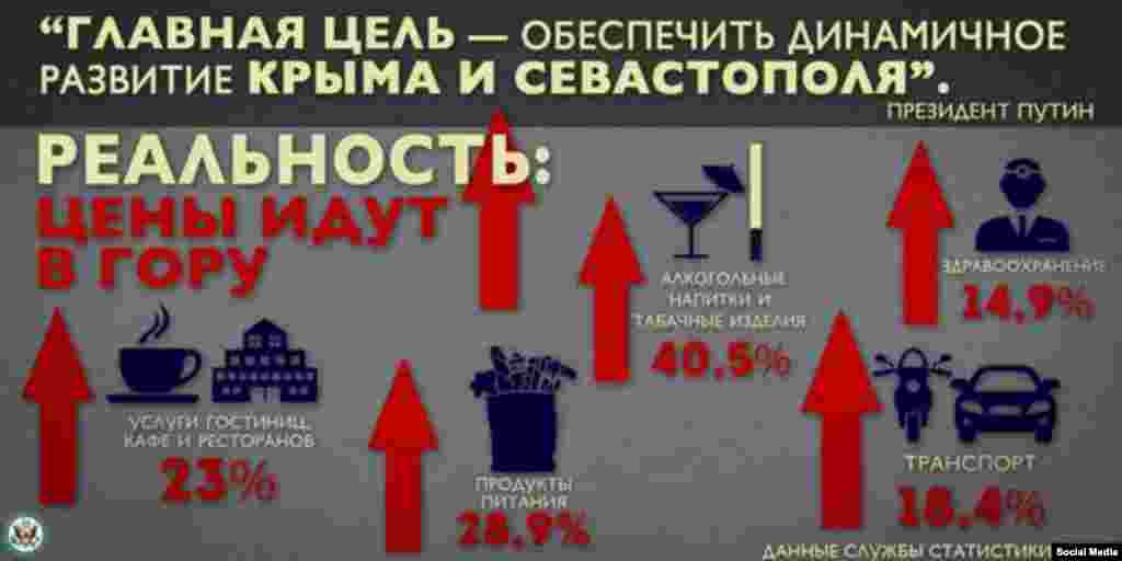 У перші дні окупації Криму російська пропаганда розповідала жителям півострова про прекрасне життя, яке на них чекає. Реальність виявилася більш жорстокою. Посольство США в Росії у своєму Twitter опублікувало серію інфографік про реальний стан справ у Криму.