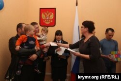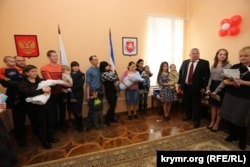 У Сімферополі дітям і немовлятам, народженим 11 квітня 2014 року, урочисто вручили примірники нової Конституції Криму, ухваленої після анексії півострова Росією.