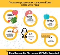 Зокрема, за даними Россільгоспнагляду, за місяць з материка поставили 19556,7 тонни овочів, 4603,7 тонни фруктів і горіхів, 651,4 тонни борошномельно-круп'яної продукції, 22 тонни зернових, 15,6 тонни бобових, 14,6 тонни олійних і 44,6 тонни інших товарів. Продуктів тваринного походження в травні поставили 16,2 тис. тонн, у живій вазі завезено 100 домашніх і 157 сільськогосподарських тварин. Крім того, завезли 8,5 млн штук курячих яєць.