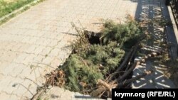 На вулиці Толстого вздовж набережної Салгіра схожа картина. На ділянці в півтора квадратних метра провалилася плитка. Відмінність лише в тому, що це зона для пішоходів.