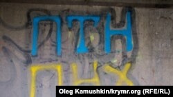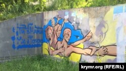 Ще один спосіб вираження – графіті. Наприклад, в районі вулиці Набережної в Сімферополі ще минулого року з'явився малюнок із зображенням людей на тлі українського прапора, яким простягав руку намальований Володимир Путін. Однак через деякий час російського президента зафарбували, залишивши тільки частину композиції – в жовто-синіх кольорах, тут же з'явився промовистий напис українською: «Ти з нами – ми з тобою».
