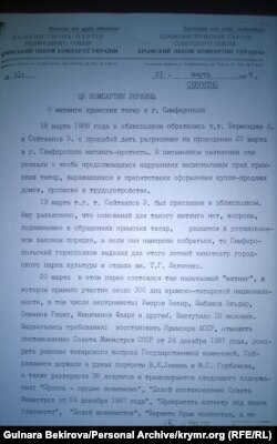 У Центральному державному архіві громадських об'єднань України збереглася інформація «Про обстановку серед кримських татар» завідувача відділом адміністративних органів ЦК Компартії України Чумака Щербицькому від 1 квітня 1988 року.