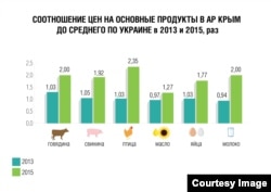Якщо 2013 року різниці між кримськими та середніми українськими цінами майже не було, то 2015 року співвідношення наочно побільшало. Якщо 2013 року ціна на м'ясо птиці в Криму всього лише на 3% була вищою, ніж на материковій Україні, то 2015 року вона зросла майже в 2,4 рази. А сервелат цього літа на овочевому ринку, який вважається найдешевшим на ЮБК, коштував захмарні 390 рублів за кілограм, що в перекладі на гривні – 195 грн.