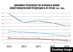 Тепер анексія автономної республіки розірвала ці зв'язки і поставила тваринництво Криму на межу знищення. Навіть за нібито офіційними даними «Кримстату», достовірність яких викликає великі сумніви через очевидне прикрашання в дусі російського агітпропу, обсяги виробництва тваринницької продукції знижуються досить швидко. Такими темпами галузь дійде до повного занепаду найближчими роками.