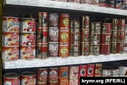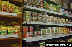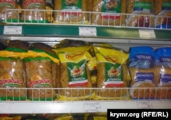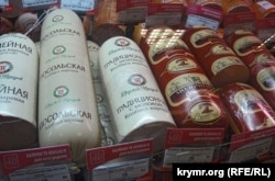 Ковбаса, в основному, місцева. Маркування «Дружба народів», що видно на ковбасі у вітрині. Був кримський радгосп, тепер це мультирегіональна торгова марка, входить до агрохолдингу «Миронівський хлібопродукт». М'ясокомбінат «Скворцово», що постачає ковбасними виробами весь Крим, взагалі належить нинішньому міністру сільського господарства Криму в уряді Аксьонова Віталію Поліщуку. Так що з ковбасою проблем немає. На привозному чи на своєму м'ясі працюють м'ясокомбінати – не знаю, але ковбас кримських брендів, причому досить якісних, вистачає. Асортимент розбавлений, як бачите, краснодарською продукцією, ціни порівнянні.