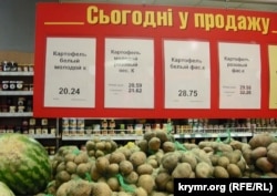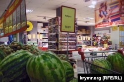 Овочі тут явно українські – і за словами продавців, і за простою логікою. Великі торгові мережі договори про постачання продуктів з дрібними виробниками не укладають – адже потрібна гарантована, безперебійна та ще й цілорічна доставка продукції в мережу. А звідки в Криму великі постачальники овочів і фруктів? Коли Крим в зоні ризикованого землеробства і заморозки кожні два роки вбивають урожай фруктів, а картопля тут росте тільки на селянських подвір'ях? Ну, хіба що цибулю місцеві корейці на півночі Криму вирощували в промислових масштабах. Але тепер, коли води в Північно-Кримському каналі немає, і корейці не допоможуть.