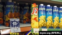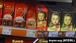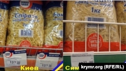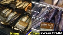 Деякі пояснення: фотографії прилавків із продуктами та цінами розташовані поруч: ліворуч – супермаркет у Києві, праворуч – у Сімферополі. Щоб не було помилок, фотографії підписані і позначені квітами прапорів України та Криму.