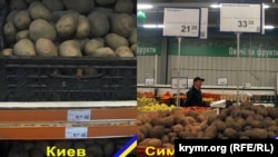 Фотографії прилавків з продуктами та цінами розташовані поруч, ліворуч – супермаркет у Києві, праворуч – у Сімферополі. Щоб не було помилок, фотографії підписані і помічені кольорами прапорів України та Криму.
