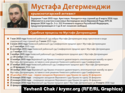 Він стверджує, що в перший же місяць арешту слідчий запропонував його синові угоду: Дегерменджи дає свідчення проти заступника голови Меджлісу Ахтема Чийгоза – і натомість опиняється на волі. Однак Мустафа на це не погодився.