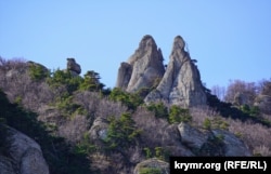 Щоправда, на саму його вершину і навіть Долину привидів ми все ж не піднялись. Наша незмінна керівниця Людмила, яка ледве не щотижня водить туристичні групи Кримом, вирішила, що група після довгої зимової перерви ще не готова до такого складного маршруту. Відтак обмежилась проходженням лише південними схилами Демерджи. Утім, звідти дивовижні химерні скелясті «зубці» (туристи нарікли їх «сімейною парою») теж справляли неабияке враження.