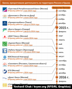 У результаті переділу банківського ринку в Криму внаслідок його російської анексії, на півострів із сусідньої Росії прийшла низка банків. Вони спробували зайняти нішу великих українських фінансових установ, витіснених 2014 року. Але успіх виявився недовгим. Крим.Реалії підрахували, що за останні два роки на півострові припинили свою діяльність щонайменше 12 російських банків.
