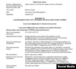 «Це витяг із державного реєстру майнових прав, я купив цю виписку. Я офіційно придбав цей документ, це доступно кожному громадянину України, по суті, це відкритий реєстр», – розповів Крим.Реалії Сергій Мокрушин.