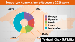 2016 рік додав нові корективи в зовнішню торгівлю: через запроваджені обмеження на ввезення/вивезення товарів із Криму (Постанова Кабміну України №1035) Україна перестала бути головним імпортером товарів для Криму. Тому за підсумками січня-березня 2016 року четвірка країн, звідки до Криму ввозять продукцію, виглядає так: Білорусь (19% усього імпорту), Вірменія (14,6%), Китай (11,8%), Іспанія (10,9 %).