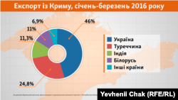 Перше місце й надалі посідає Україна, куди, якщо вірити статистиці окупантів, вивезли продукції на суму 3,4 мільйона доларів США (46 відсотків усього експорту). У порівнянні з аналогічним періодом 2015 року, цей показник скоротився в 1,6 раза, але при цьому частка кримського експорту в Україну зросла вдвічі – з 22,3 до 46 відсотків. Загалом, окрім України, кримську продукцію експортувати особливо нема куди.