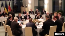 Зустріч у Берліні щодо України відбувалася у три етапи. Першим до столиці Німеччини прибув президент України Петро Порошенко і зустрівся з канцлером Анґелою Меркель, яка приймала саміт.