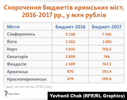 Однак 2017 року на кілька міст півострова чекав неприємний сюрприз. Бюджети Керчі, Феодосії та Євпаторії скоротили втричі, Армянська і Красноперекопська ‒ в чотири-п'ять разів у порівнянні з минулим роком. Прибутки сімферопольської скарбниці начебто навіть зросли на мільярд рублів, але в порівнянні з відкоригованими показниками 2016 року, навпаки, вона «схудла» на 2,4 мільярда рублів. Аналогічна картина склалась і в інших містах Криму.