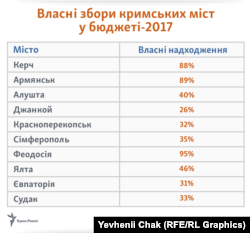 Характерно, що наймасштабніші скорочення торкнулися казни тих міст, де є бюджетотвірні промислові підприємства (за винятком, мабуть, Євпаторії). Наприклад, у бюджетах Керчі й Армянська власні надходження становлять 88 відсотків, у Феодосії ‒ 95 відсотків прибутків бюджету.