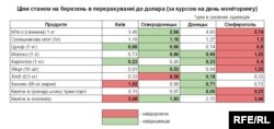 Моніторинг цін у Києві, Сєвєродонецьку, окупованому Донецьку та анексованому Сімферополі, кореспонденти Радіо Свобода проводять з початку 2017 року. Пропонуємо ознайомитись, як змінювались ціни протягом місяця й де продукти та послуги є найдорожчими, а де – найдешевшими.