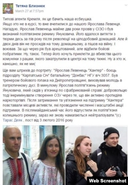 «Із Дніпропетровщини звернулась дружина Левенця. Розповіла, що йому дуже довго ставили палки в колеса, що він активіст, націоналіст у такому східному містечку. Тренер бойового гопака. Він сам за фахом вчитель фізкультури, відкрив там цю секцію. Вона казала, вчепились до нього, навішавши, звинувативши в економічних злочинах», – розповідає Близнюк.