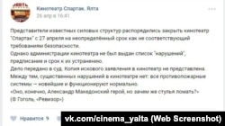 Прокуратура Ялти 27 квітня відрапортувала про закриття трьох об'єктів: кінотеатру «Спартак» і торговельних центрів «Конфетті» та «Будинок торгівлі». У повідомленні відомства стверджується, що в цих установах порушуються правила пожежної безпеки.
