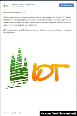 «Усі системи пожежної безпеки справно функціонують згідно з новими вимогами, запровадженими в регіоні. Від сьогодні ТЦ «Південна галерея» працює в повному обсязі», ‒ йдеться в повідомленні.