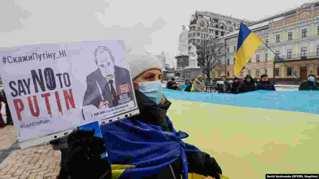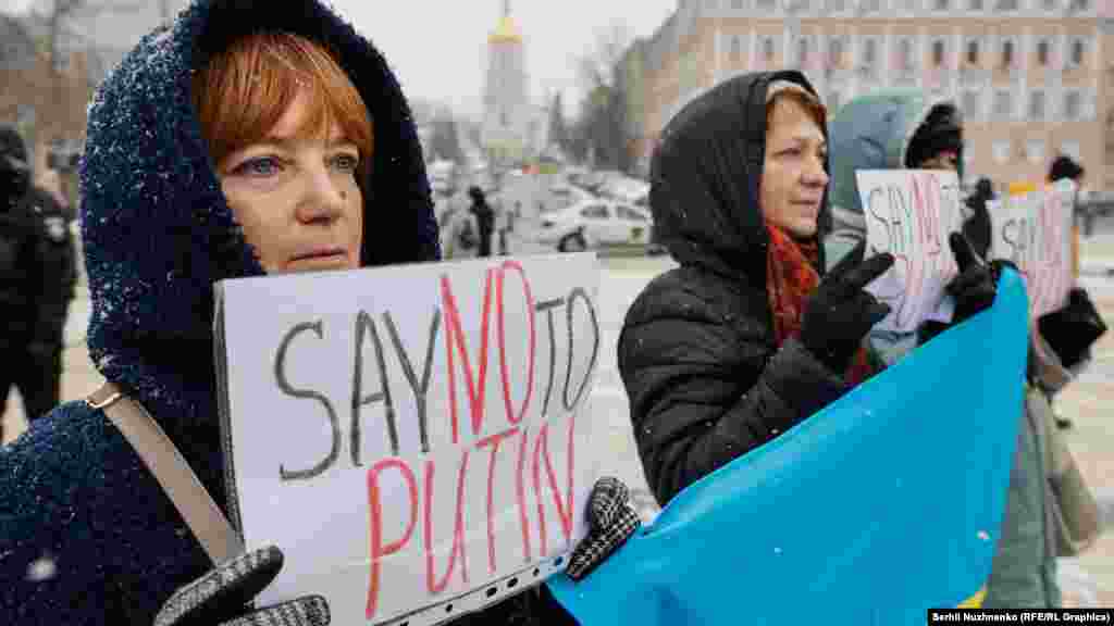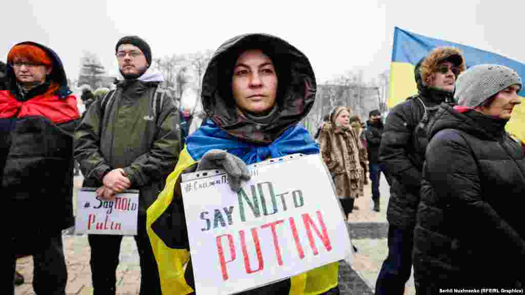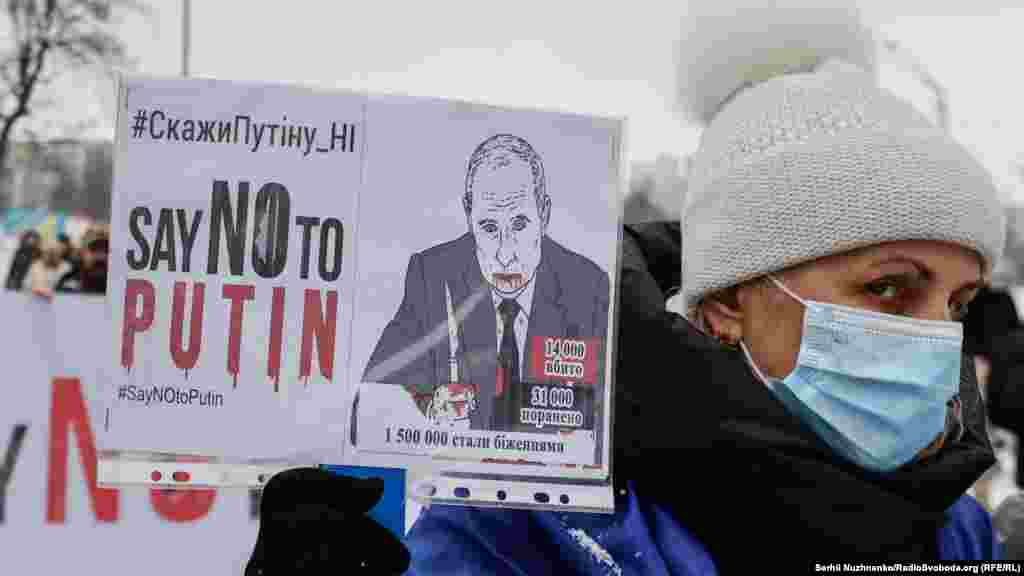 Активісти тримали у руках плакати з гаслами «SayNOtoPutin» і «UkrainiansWillResist» – «Скажи Путіну ні» і «Українці чинитимуть опір» і інші