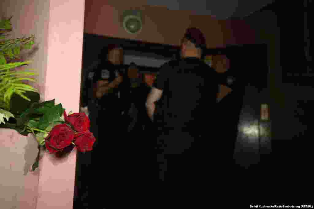 Поліція охороняє вхід до під'їзду будинку, де було вбито Аркадія Бабченка