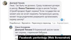 Батьки кримських школярів у соціальних мережах висловлюють занепокоєння щодо слабких заходів безпеки в школах. На сторінці в Facebook голови адміністрації Ялти Яніни Павленко кримчани діляться занепокоєннями з приводу відсутності охорони.