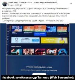 «За ухваленим депутатами Держдуми (Росії ‒ КР) законом на всю техніку встановлюється російське програмне забезпечення. Питання: навіщо мені це сміття в телевізорі, якщо офіційний додаток «Первого канала» відмовляється показувати мені Олімпійські ігри в моєму регіоні! А мій регіон, між іншим, ‒ це Крим, а Крим ‒ це Росія, чи як?» ‒ пише він у соцмережах.