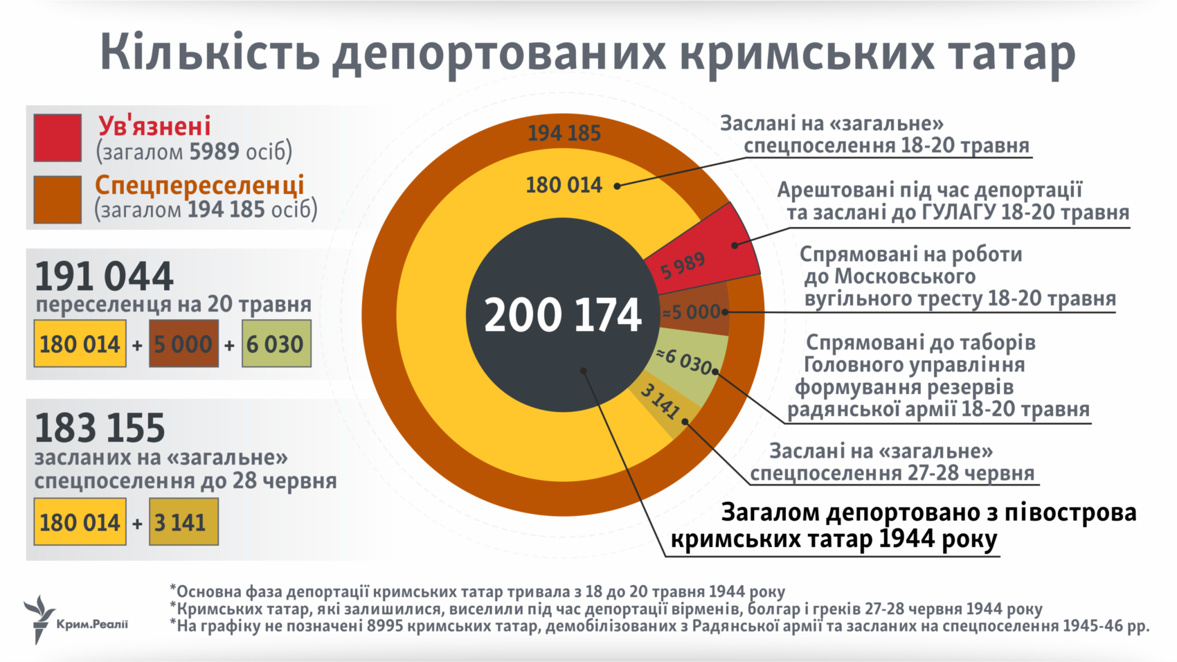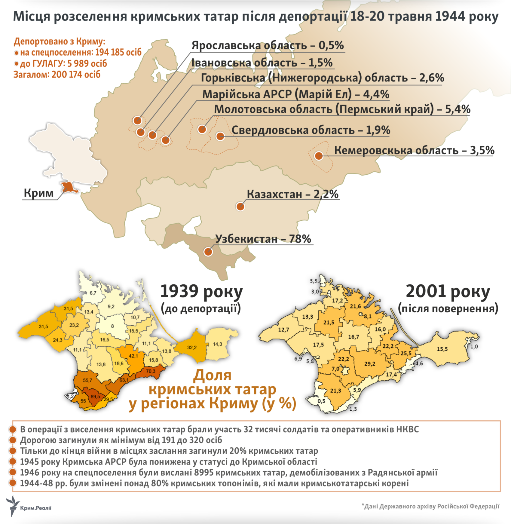 18 травня 1944 року сталінський режим здійснив ще один злочин ‒ без суду та слідства вигнав зі своєї батьківщини та прирік на довічне заслання весь кримськотатарський народ. Як привід були використані звинувачення в масовому дезертирстві та колабораціонізмі кримських татар, які у 1967 році були відкинуті самою радянською владою, але тиражовані досі. Про підготовку до депортації та її проведення, зокрема виселення та місця вигнання розповідають оригінальні документи й інфографіка від авторів Крим.Реалії