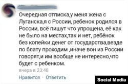«Дружина з Луганська, я з Росії, дитина народилася в Росії. Усі пишуть, що в такому випадку процедура спрощена, але її як не було, так і немає. Дитина без копійки від держави. Всюди по «блату» ходимо, або «Геть із Росії», – написали в соцмережі.