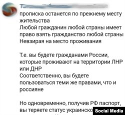– Та ж сама залишається. Тобто ви будете громадянами Росії, які проживатимуть «в ЛНР та ДНР». Тобто у вас будуть пільги і права, як і в росіян.