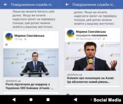 Два інші заблоковані Facebook матеріали виявилися новинами. У першій йшлося про напад та захоплення Росією українських суден у нейтральних водах Керченської протоки, де цитувались слова міністра закордонних справ Павла Клімкіна, що це «абсолютно новий рівень провокацій та агресії» і є бажанням Росії «захопити Азовське море».