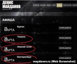 Проте, на офіційному сайті Дениса Майданова досі немає ні анонсу, ні будь-яких згадок про участь артиста в концерті в Криму 18 березня. В цей день, згідно з афішею артиста, він мав виступати в трьох тисячах кілометрів від Сімферополя ‒ в російському Нижньому Тагілі, наступного дня ‒ в Єкатеринбурзі.
