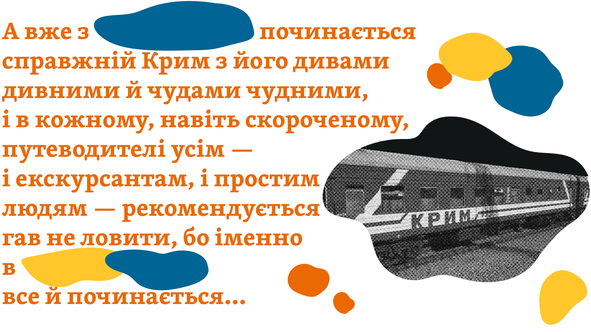 Це Сімферополь. 1924 року, будучи в Криму, Остап Вишня написав збірку невеликих гумористичних оповідань про Крим – «Вишневі усмішки кримські». Це жартівливий «путівник» для тих, хто хоче подорожувати півостровом. Для багатьох туристів Крим справді «починається» із Сімферополя – із прибуття на вокзал кримської столиці.