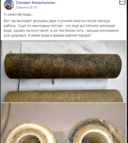 У Сімферополі проблеми з водою почалися наприкінці червня. У будинках різних районів міста з кранів потекла каламутна жовта вода. Місцевий житель Салават Хісматуллін показав, як виглядає його водний фільтр через місяць використання.