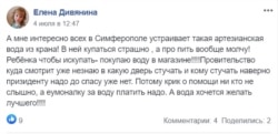 «А мені цікаво, чи всіх у Сімферополі влаштовує така артезіанська вода з крана? У ній купатися страшно, а про пити взагалі мовчу! Дитину щоб скупати, купую воду в магазині! Уряд куди дивиться? Вже не знаю, в які двері стукати», ‒ пише городянка Олена Дівяніна у групі звернень до російського глави Криму Сергія Аксенова.