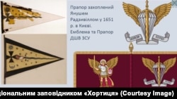 «В часи Хмельниччини, битви під Берестечком 1651 року, найбільш масштабної і важкої для Богдана Хмельницького, всі основні козацькі військові сили були саме там. І Київ залишився неприкритий, чим скористався литовський князь Януш Радзвілл. Він, зайшовши зі сторони сучасної Білорусії, увійшов у Київ, і захопив як трофеї козацькі прапори. На Чернігівщині він розбив Чернігівський і Ніжинський полки, також взявши в трофеї їхні прапори. Згодом прапори були також і в Києві захоплені. Ці козацькі стяги за традицією були передані в скарбницю Речі Посполитої. А незабаром стався так званий «шведський потоп», коли на Річ Посполиту напала Швеція і була захоплена польська королівська скарбниця. Звідти козацькі прапори потрапили до Стокгольму, де вони зберігаються зараз», – пояснює фахівець історію козацького прапора з зображенням так званого меча Архистратига Михаїла.