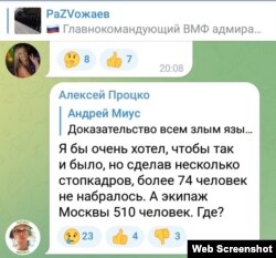 Міноборони Росії мовчить. Єдине, що було зроблено офіційно, – це публікація 16 квітня відео про те, що головнокомандувач ВМФ Росії Микола Євменов зустрівся в Севастополі з екіпажем крейсера. На плацу, за різними підрахунками, від 74 до 200 моряків. Звуку немає. У кримських соцмережах ставлять питання.