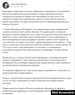 Раніше Дмитро Шкребець розповів Крим.Реалії про те, що кілька сімей моряків, які зникли безвісти на крейсері «Москва», звернулися у військкомат, щоб «дізнатися правду про те, що сталося насправді».