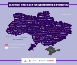 За даними на листопад на онлайн-платформі громадського контролю державних закупівель Dozorro, від січня 2020 року через електронну систему ProZorro медичні заклади України загалом придбали 9 тисяч кисневих концентраторів на 503 млн грн.