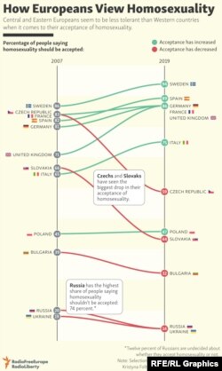 – Я знаю про це дослідження, і воно мене дещо здивувало – і не результати щодо України та Росії, а я звернув увагу на результати щодо Чехії. Там, згідно з цим дослідженням, погіршилося ставлення до гомосексуальності з 2007-го із 83% до 59%, але переді мною також є дослідження Pew research center нещодавнє про одностатеві шлюби, і там вказано, що у Чехії їх підтримують 65%. Оця різниця між тими, хто приймає гомосексуальність, і тими, хто підтримує одностатеві шлюби, є досить великою, і її не можна пояснити статистичною помилкою, тож я думаю, що багато що в таких дослідженнях залежить від методики і того, як сформульовано запитання. Я б дуже обережно до цього всього ставилося.